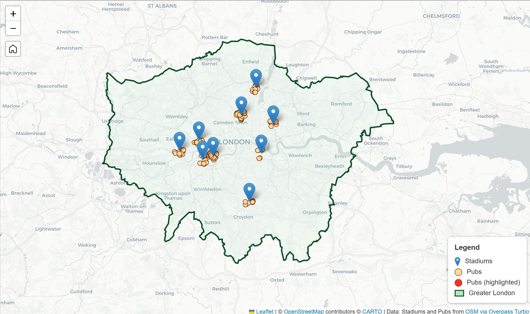 This project features an interactive web map built with Leaflet.js and HTML, mapping major football stadiums in London alongside pubs within a 1 km radius. Spatial data was sourced from OpenStreetMap (OSM) using Overpass Turbo.
